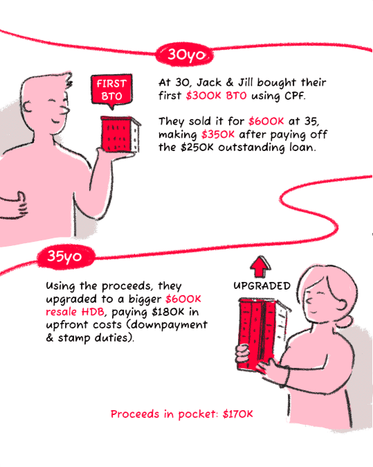 Fast forward five years. You’re 35 now. The BTO, your starter home, has appreciated significantly. Jack and Jill sold theirs for a remarkable $600,000, making a profit of $350,000 after settling the outstanding $250,000 loan. This substantial gain wasn’t just a windfall; it was the foundation for their next move. With $170,000 proceeds in hand after upfront costs, they weren’t just richer; they were ready to leverage this capital.