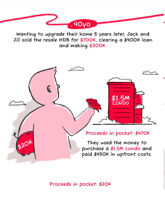 At 35, instead of cashing out and spending, Jack and Jill used those proceeds to upgrade to a bigger $600,000 resale HDB. They paid $180,000 in upfront costs, including the downpayment and stamp duties, leaving them with $170,000 in cash. While it might seem like they spent all their profits, remember, they were upgrading their living space while retaining capital.