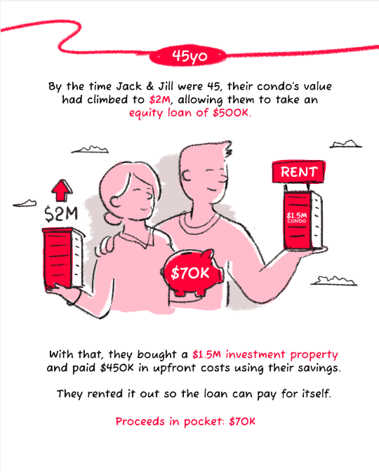 By the time you’re 45, your $1.5 million condo has become a $2 million asset. This is where Jack and Jill unlocked a powerful tool: an equity loan. They took out $500,000 against their appreciated home. With $70,000 in proceeds from their prior transactions and current equity, they made another strategic move.