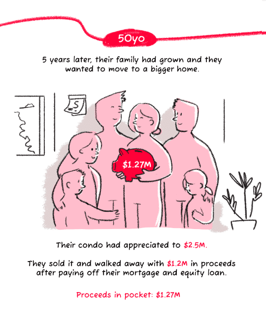 At 50, your family has likely grown, and you might be dreaming of even more space. Jack and Jill were no different. Their $2 million condo had appreciated further to $2.5 million. They sold it, walking away with a substantial $1.27 million in proceeds after settling their mortgage and equity loan.