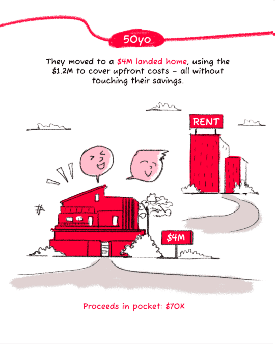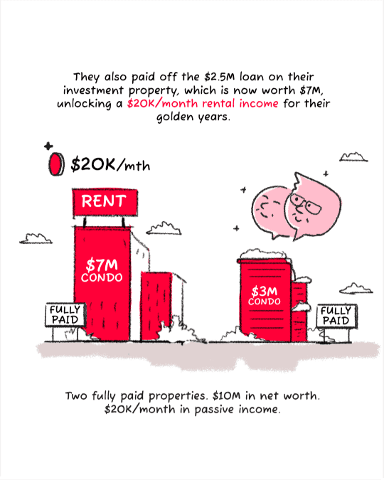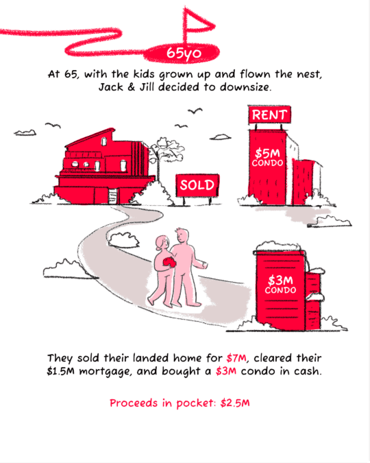 Finally, at 65, with the kids grown and living their own lives, Jack and Jill decided it was time to downsize their personal residence. They sold their $4 million landed home for an impressive $7 million, cleared their $1.5 million mortgage, and bought a $3 million condo in cash. This single transaction left them with $2.5 million in their pocket.