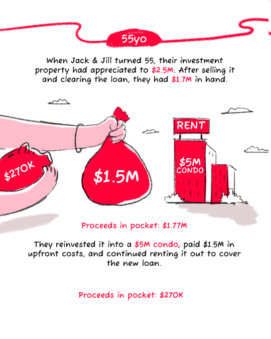 Five years later, at 55, your investment property has also flourished, appreciating to $2.5 million. Jack and Jill sold it, clearing the loan and ending up with $1.7 million in hand. Did they splurge? No. They reinvested $1.5 million into a $5 million condo, continuing their strategy of renting it out to cover the new loan. This move further diversified their portfolio and solidified their passive income stream. They now had $270,000 in hand from this transaction, adding to their growing reserves.