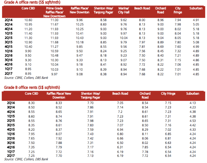 Based on data up to Q2 2017, the decentralisation trend is continuing, resulting in rental rates continuously declining for 9 consecutive quarters. In general, rental values especially for Premium and Grade A office spaces have all currently fall below S$10 psf (which is a rare occurrence especially for Prime Grade Raffles Place offices) presenting itself as an interesting proposition for newer tenants.