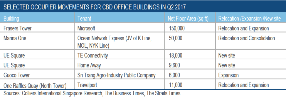 On the flip side, despite the decentralisation trend, the narrowing rental price gap between CBD and outer CBD office spaces are making CBD office spaces for rental more worthwhile and attractive, thus starting a trend of ‘flight-to-quality’. Occupancy pre-commitment of the new spaces have shown a heathy increase. For instance, within H1 2017, the 1.88 million sq ft Marina One as well as V on Shenton were already 70% pre-leased, while Guocco Tower were 93% pre-committed and almost all of the 130,000 sq ft left vacated by Google at Asia Square Tower 1 has already been backfilled. This trend is noticeable based on occupier trends as depicted below: